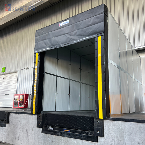 【特点】:更严实的密封保护;货车尺寸统一时的最优选择;顶部门帘标配为固定式海绵结构,也可选配垂帘式与可调式;墙体须有承载承压能力。